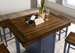 At first glance, a few things stand out on this unique dining set. The two-tone finish lends to a unique combination of antique dark oak and muted bluegiving off that island-inspired vibe. Upon closer inspection, the pedestal base is revealed to be a storage cabinet, while two support legs flank the sides for stability. The smooth table top displays beautiful grain patterns, and stool seats are contoured for unmatched comfort.