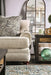 This is an oversized neutral-colored chair that is ideal for maximum comfort. It features the bouyancy of an overstuffed broad seat cushion (zippered and reversible) and an extra-plush large back pillow. The inclusion of matching accent pillows establishes a direct contrast for a traditional look. A subtle knit pattern provides a slight sense of texture to the soft beige fabric upholstery. Polished dark-stained wood bun feet ensure stability to a frame that is so thoroughly padded every inch is soft to the touch.