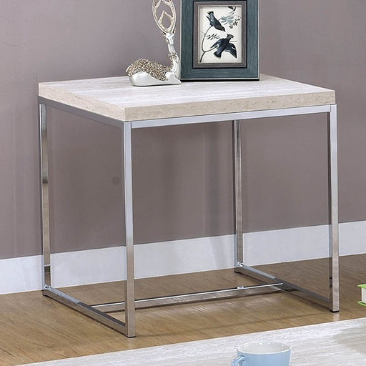 TITUS End Table, White/Chrome, 26"L X 23 1/2"W X 23 3/4"H, 38.06lbs. Each table is available individually, but they all display the same distinct v...