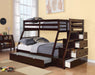 ACME Jason Twin/Full Bunk Bed & Drawers, Espresso (1Set/2Ctn), 79" x 57" x 65"H, 136lbs. The Jason Bunk Bed is a great addition to any youth room. A twin upper bed and full size lower bed offer lots of space for sweet dreams. Carefully crafted with selected wood and veneers in rich, classic espresso finish gives this piece a stylish look and makes it ideal for blending with an array of different designs. The final fabulous feature: an under-bed storage drawers, is perfect for stowing away toys, clothes, linens, and so much more! Features: - Twin/Full Bunkbed & 2 Drawers - Slat System Included (6+6) - Convertible (To be used Stacked or 2 Separated Beds) - Right Facing Front Ladder (Built-in) - Full Length Guard-Rail - Jason Collection: Available in 4 Colors Honey Oak 02018, Espresso 02020, Gray 37840, White 37040. ALSO Available with Storage Ladder 37015, and XL Twin/Queen Espresso 37425, White 37040 Materials: Wood, Composite Wood